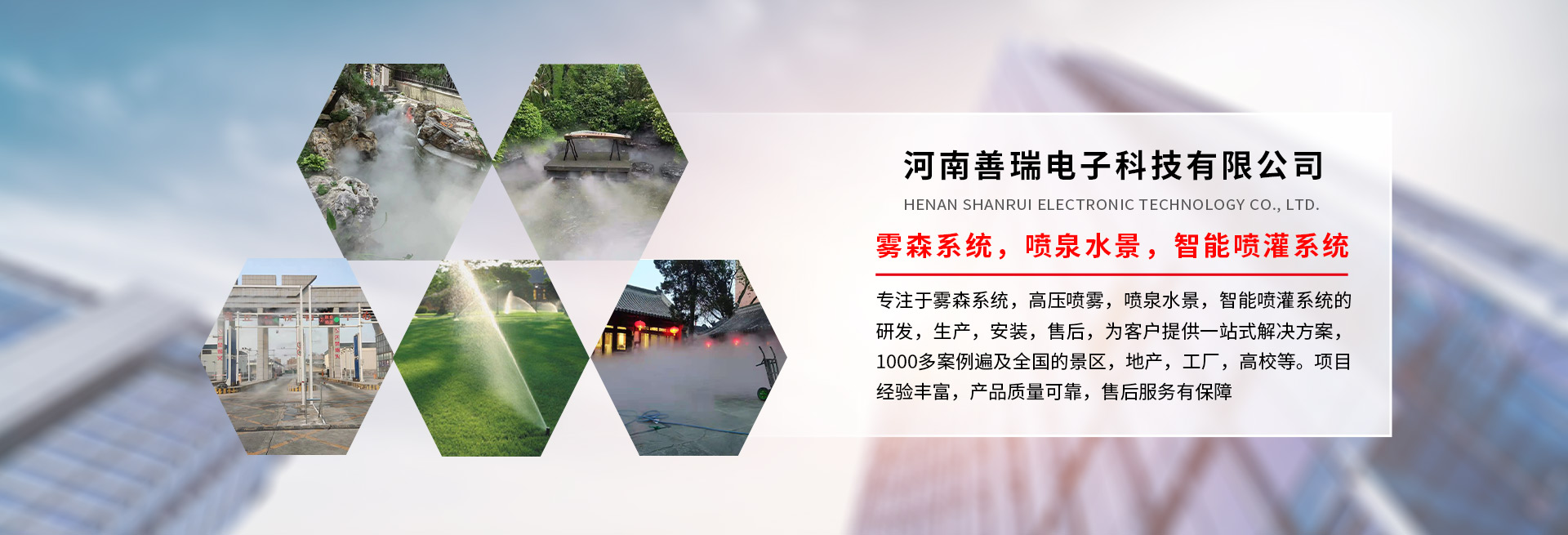 河南善瑞电子科技有限公司是高新技术企业,专注于雾森景观造雾,喷雾消毒除臭,喷泉水景,智能喷灌系统的研发,生产,安装,售后,为客户提供一站式解决方案,公司在雾森喷雾,喷泉,喷灌领域取得多项专利和知识产权,1000多案例遍及全国的景区,地产,工厂,高校等。项目经验丰富,产品质量可靠,售后服务有保障,可免费提供方案,全国上门安装。